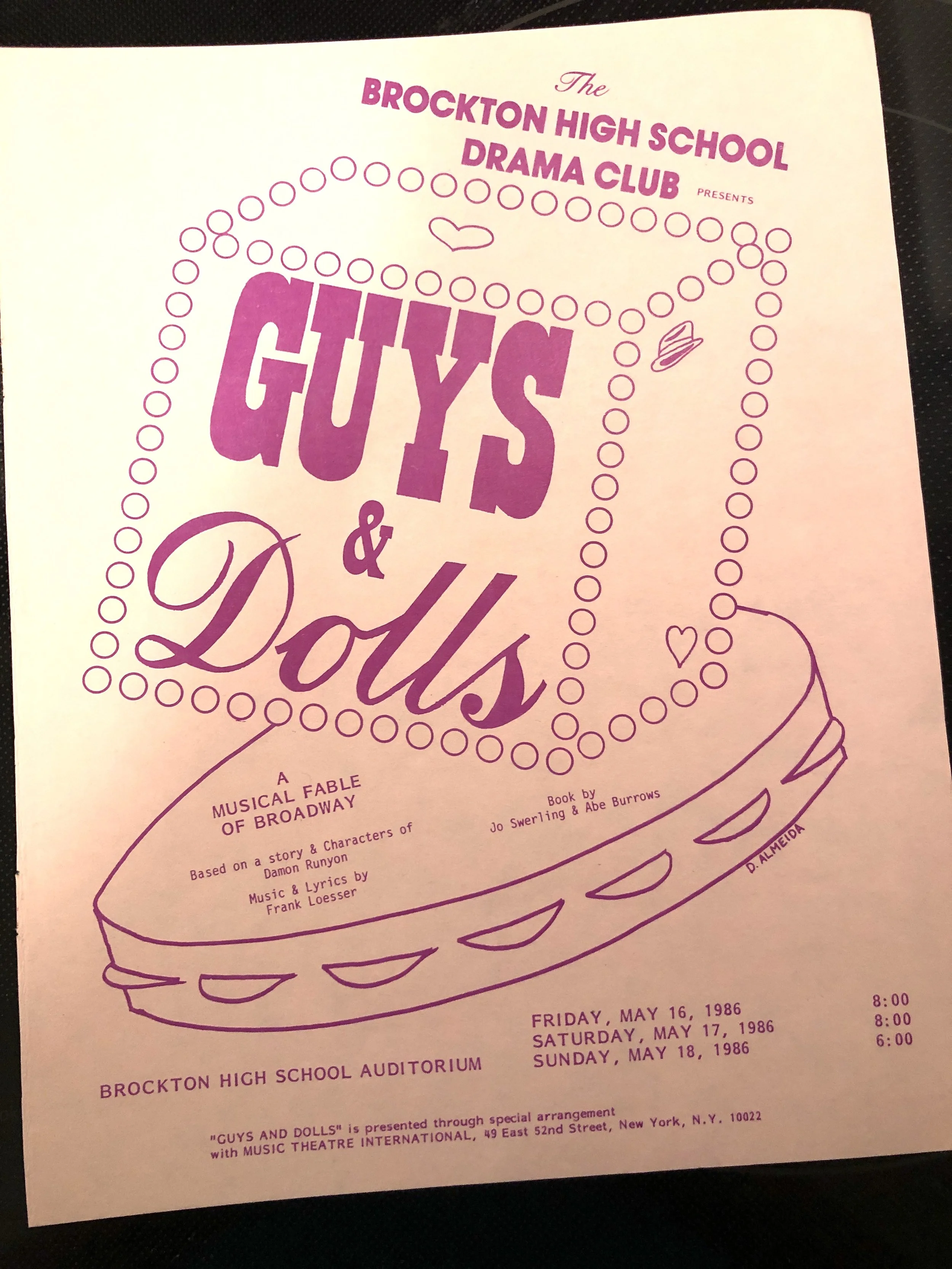 Once again, my memory failed me… I looked it up and my senior musical performances were the week AFTER the season finale of TFOL (May 16-18, 1986). Please enjoy: our program/poster design (by 17-year-old ME), and my big number “Sit Down Your Rockin’ The Boat” as Nicely-Nicely Johnson in Guys And Dolls.